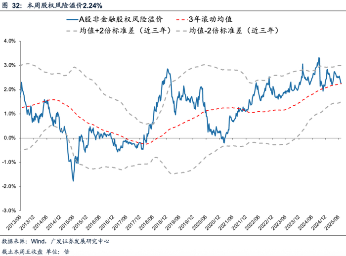 本周股权风险溢价从上周2.30%下降至本周2.24%,股市收益率从上周3.97%下降至本周3.91%。