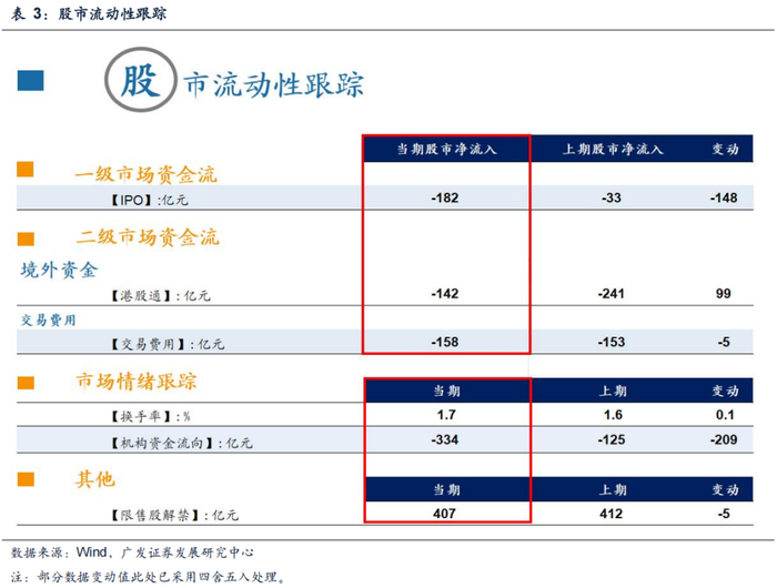 流动性:本周日均换手率小幅回落,交易情绪维持活跃。一级市场方面,本周IPO规模为182亿元,前一周IPO规模为33亿元。二级市场方面,截止本周四南下资金净流入142亿元,上周净流入241亿元,交易费用158亿元。投资者情绪方面,本周日度平均换手率为1.65%,前一周为1.72%;机构资金净流出334亿元,前一周流出123亿元。本周限售股解禁407亿元,前一周限售股解禁412亿元,预计下周限售股解禁871亿元。