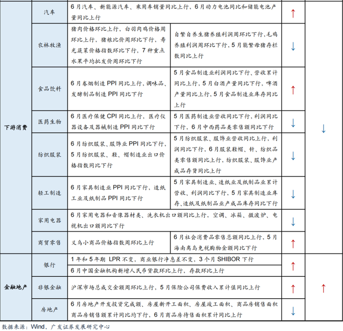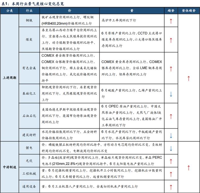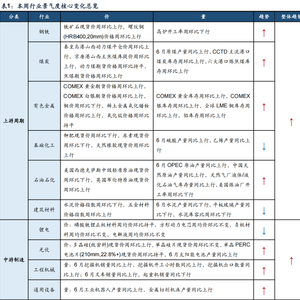本周景气度改善的方向主要在钢铁、煤炭、有色金属、石油石化、光伏、工程机械、通用设备、消费电子、半导体、汽车、食品饮料、商贸零售、银行、非银金融等领域,涨价线索明显的有:上游的钢铁、煤炭、有色金属、石油石化,中游的光伏,tmt领域的消费电子、半导体,下游的食品饮料、商贸零售。具体来看,根据Wind数据统计,上游资源品中,COMEX黄金期货价格周环比上行,COMEX白银期货价格周环比上行,铜价周环比下行,稀土金属氧化镨钕价格周环比上行,氧化铽价格周环比持平。钾肥现货价周环比下行,尿素现货价周环比上行,天然橡胶现货价周环比上行。tmt制造领域,DRAM平均现货价周环比上行,NAND平均现货价周环比上行。金融地产方面,沪深市场总成交金额周环比上行,房地产目前总体需求仍然较弱。