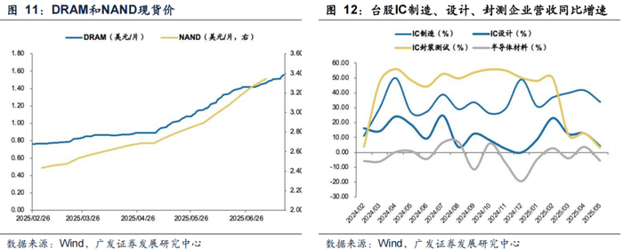 价格方面,截至7月17日,DRAM(DDR34Gb 512Mx8 1600MHz)现货价1.56美元/片,周环比上行,截至7月7日,NAND(Flash:32Gb 4Gx8 MLC)现货价3.35美元/片,周环比上行。业绩方面,台股IC制造营收5月同比上行33.87%,IC设计营收同比上行4.27%,IC封装测试营收同比上行3.27%。