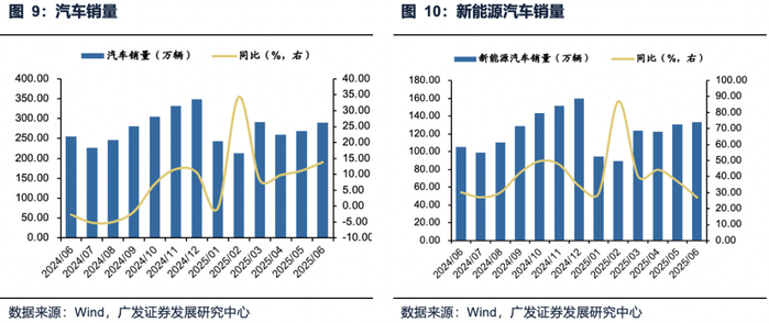 6月汽车销量290.45万辆,当月同比上行13.83%;6月汽车产量280.86万辆,较4月同比上行8.80%。6月乘用车产量244.06万辆,当月同比上行12.10%;6月乘用车销量253.55万辆,当月同比上升14.49%,6月新能源汽车销量132.90万辆,当月同比上行26.74%,6月新能源汽车产量123.40万辆,较上月同比上行20.39%。电池方面,6月动力电池和储能电池产量为129,200兆瓦时,当月同比上行51.40%。