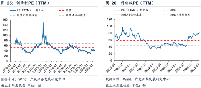 创业板PE(TTM)从上周45.06倍上升到本周46.04倍,PB(LF)从上周3.62上升到本周3.70倍;科创板PE(TTM)从上周的79.36倍上升到本周81.76倍,PB(LF)从上周4.08倍上升到本周4.21倍。
