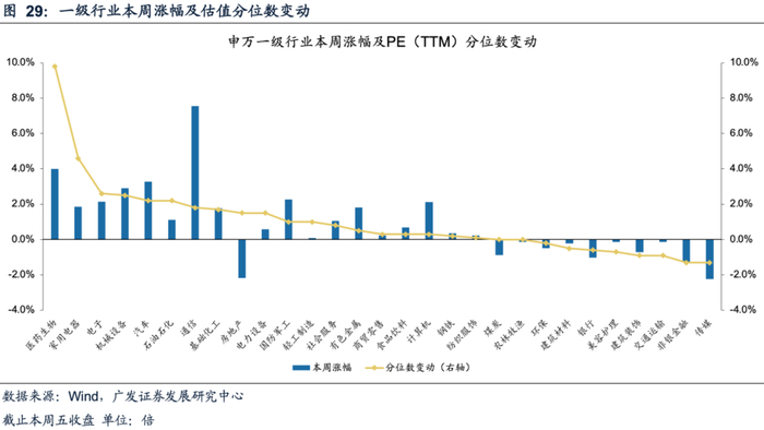 行业角度来看,本周PE(TTM)分位数扩张幅度最大的行业为医药生物、家用电器、电子。PE(TTM)分位数收敛幅度最大的行业为传媒、非银金融、交通运输。