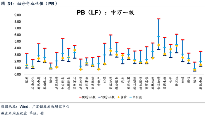 从PB角度来看,申万一级行业中,石油化工、有色金属、基础化工、钢铁、建筑材料、电力设备、建筑装饰、公共事业、交通运输、房地产、环保、美容护理、社会服务、家用电器、轻工制造、纺织服饰、商贸零售、农林牧渔、食品饮料、医药生物、计算机、传媒、通信、银行、非银金融估值低于历史中位数。本周没有行业估值高于历史90分位数。