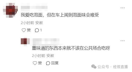 部分网友觉得小题大做,“有规定吃泡面的需要被抓起来吗”。但也有网友表示理解,认为方便面的味道确实比较浓重。“我爱吃泡面,但在车上闻到泡面味会难受。”