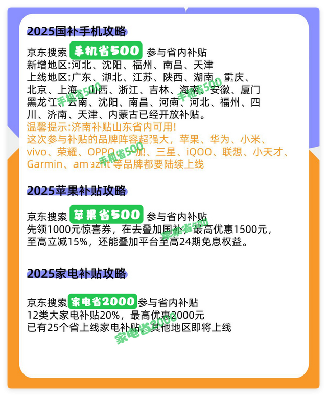 地方加码:薅羊毛终极攻略 广东:国补+“粤焕新”地方券,综合省30%(线下门店专属) 江苏:每日10点抢券,可叠加企业让利(如冰箱再折上折) 湖北:新增空气净化器、投影仪补贴,数码加码10% 长春:云闪付扫码领券,每日12:00发放,当日有效