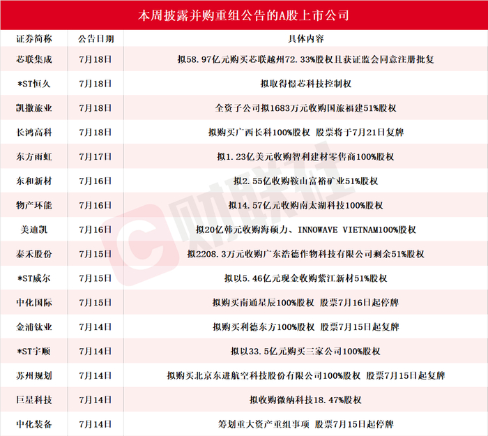 据财联社不完全统计,截至发稿,本周披露并购重组进展的A股上市公司共有16家,包括芯联集成、*ST恒久、凯撒旅业、长鸿高科、东方雨虹、东和新材、物产环能、美迪凯、泰禾股份、*ST威尔、中化国际、金浦钛业、*ST宇顺、苏州规划、巨星科技和中化装备,具体情况如下图: