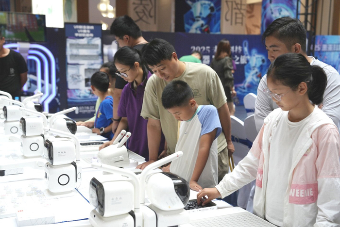 在VR运动区,年轻人戴上设备挥汗如雨,虚拟篮球精准入筐。书法机器人展区排起长队,市民李先生拿到机器人书写的“梦开始”作品,赞叹不已:“这比印刷体更有温度,是科技与人文的结合。”积木编程区成为小创客的乐园,孩子们专注组合模块,指挥机器人完成寻路任务。