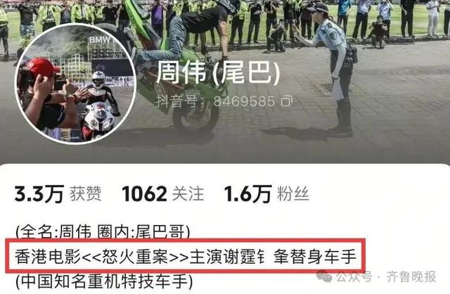 在周伟的社交账号简介上,显示他是电影《怒火重案》主演谢霆锋的替身车手,也是知名重机特技车手,其账号里都是有关骑摩托车的视频。