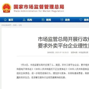 7月18日,市场监管总局约谈饿了么、美团、京东三家平台企业,要求相关平台企业严格遵守《中华人民共和国电子商务法》《中华人民共和国反不正当竞争法》《中华人民共和国食品安全法》等法律法规规定,严格落实主体责任,进一步规范促销行为,理性参与竞争,共同构建消费者、商家、外卖骑手和平台企业等多方共赢的良好生态,促进餐饮服务行业规范健康持续发展。