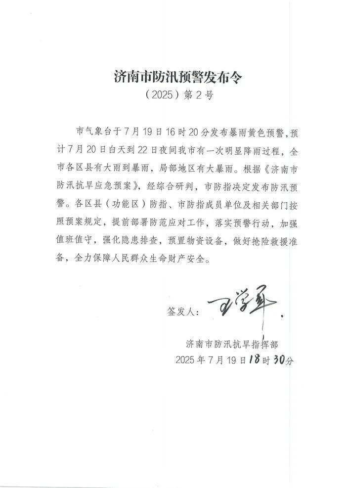 记者从济南市防汛抗旱指挥部获悉,7月19日18时30分,济南市发布防汛预警。