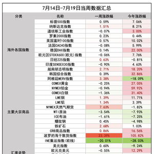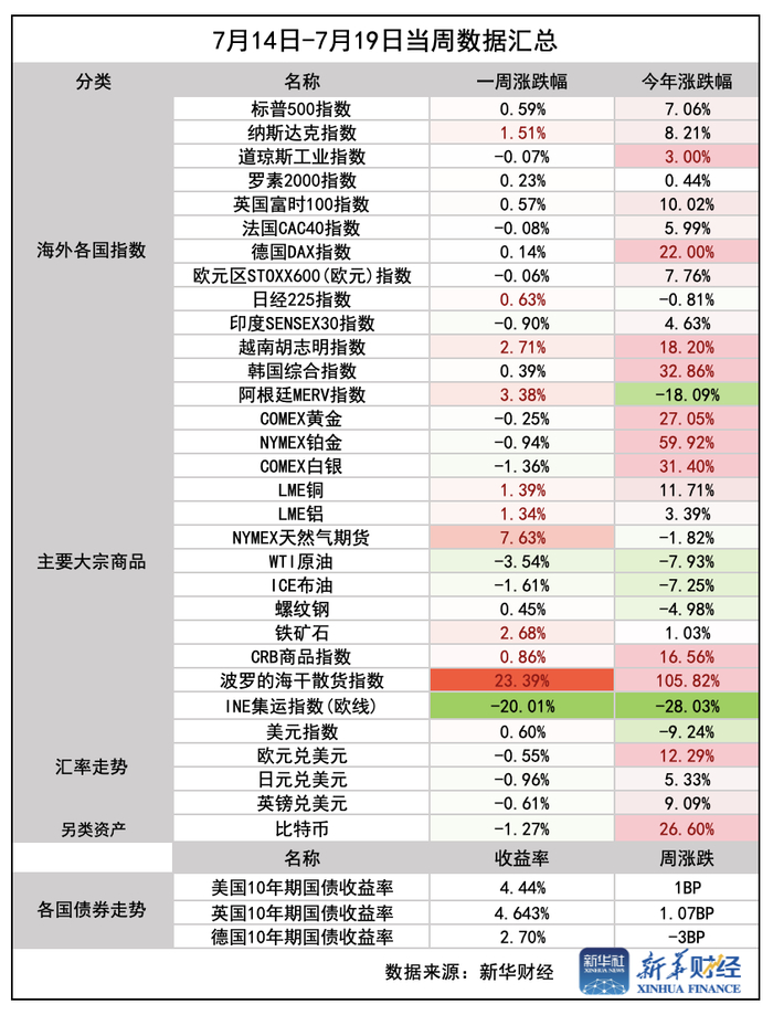 新华财经上海7月20日电(葛佳明) 本周(7月14日-7月19日),6月美国消费者价格指数(CPI)反弹,显示美国加征关税政策带来的成本压力正传导至消费端,但整体通胀压力仍较为温和,目前多数美联储官员支持继续观望,等待美国经济数据进一步明确。美元指数微涨,全球多数股指以宽幅震荡为主,黄金、白银小幅收跌。