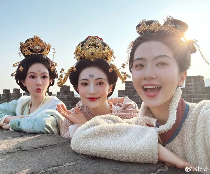 晒出的照片中,杨紫和李现、张雅钦等演员开心互动,嘟嘴比V,感情十分要好。
