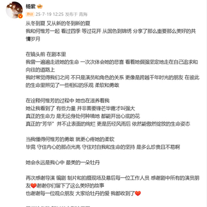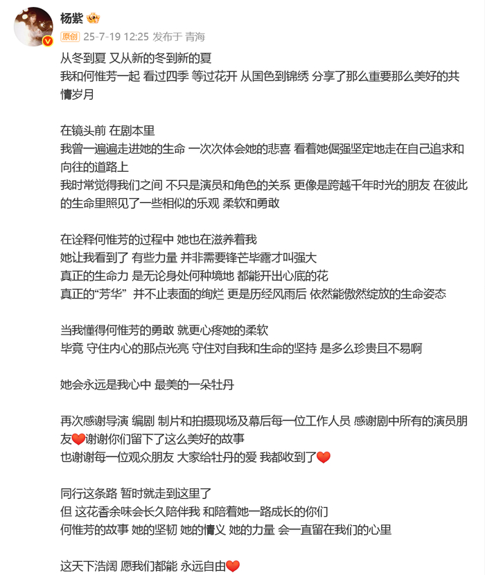 杨紫写道:“我和何惟芳一起,看过四季,等过花开。从国色到锦绣,分享了那么重要那么美好的共情岁月。在镜头前,在剧本里,我曾一遍遍走进她的生命,一次次体会她的悲喜,看着她倔强坚定地走在自己追求和向往的道路上。我时常觉得我们之间,不只是演员和角色的关系,更像是跨越千年时光的朋友,在彼此的生命里照见了一些相似的乐观,柔软和勇敢。在诠释何惟芳的过程中,她也在滋养着我,她让我看到了,有些力量并非需要锋芒毕露才叫强大。真正的生命力,是无论身处何种境地,都能开出心底的花。真正的‘芳华’并不止表面的绚烂,更是历经风雨后,依然能傲然绽放的生命姿态。当我懂得何惟芳的勇敢,就更心疼她的柔软。毕竟,守住内心的那点光亮,守住对自我和生命的坚持,是多么珍贵且不易啊!她会永远是我心中最美的一朵牡丹。”