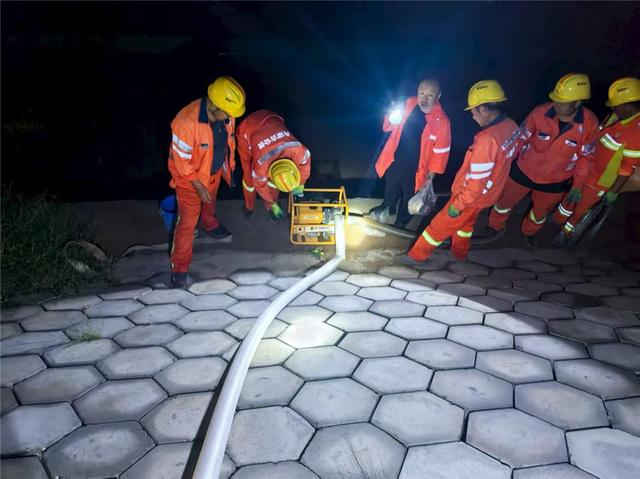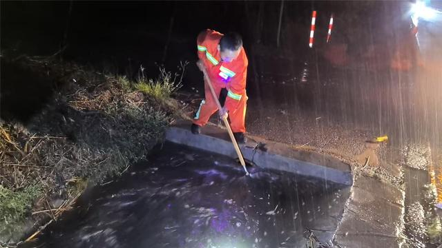 7月19日凌晨,鄂尔多斯市道路养护服务中心鄂托克前旗公路工区工作人员在雨中巡查并处置险情。