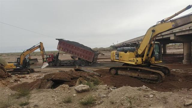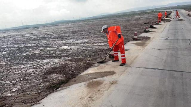 鄂尔多斯市道路养护服务中心鄂托克公路工区工作人员在216省道进行雨后过水路面清理作业。
