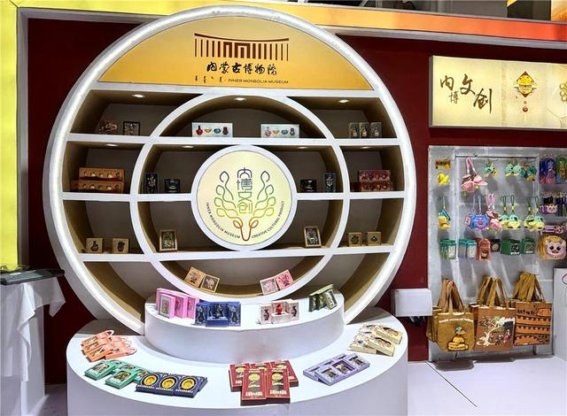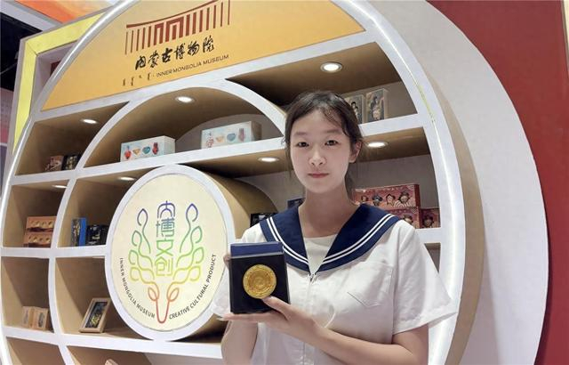 7月19日,在第九届内蒙古自治区文化产业博览交易会文博文创展区,由内蒙古博物院推出的摩羯戏珠纹金花银盘文创冰箱贴受到广泛欢迎。