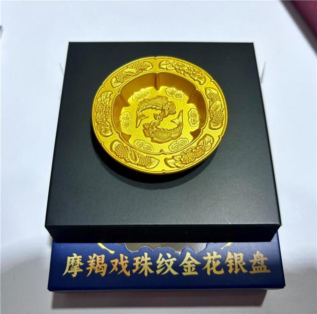 摩羯戏珠纹金花银盘文创冰箱贴为文物复原系列冰箱贴,将文物的外形、纹样进行提取复制,满足广大市民群众把“文物”带回家的心愿。