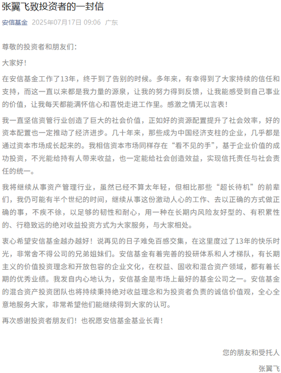 7月17日安信基金服务号转发了一篇《张翼飞致投资者的一封信》,张翼飞称自己将继续从事资产管理行业,认为安信基金有着完善的投研体系和人才梯队,是市场上最好的基金公司之一。