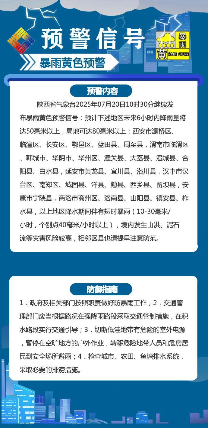 陕西省气象台2025年07月20日10时30分继续发布暴雨黄色预警信号:预计下述地区未来6小时内降雨量将达50毫米以上,局地可达80毫米以上:西安市灞桥区、临潼区、长安区、鄠邑区、蓝田县、周至县,渭南市临渭区、韩城市、华阴市、华州区、潼关县、大荔县、澄城县、合阳县、白水县,延安市黄龙县、宜川县、洛川县,汉中市汉台区、南郑区、城固县、洋县、勉县、西乡县、留坝县,安康市宁陕县,商洛市商州区、洛南县、山阳县、镇安县、柞水县,以上地区降水期间伴有短时暴雨(10-30毫米/小时,个别点40毫米/小时以上),境内发生山洪、泥石流等灾害风险较高,相邻区县也请提早注意防范。