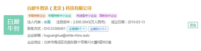 白犀牛智达(北京)科技有限公司(简称:白犀牛)成立于2019年3月,注册资金为2,695.0943(万人民币),是一家专注于L4级自动驾驶技术的高科技企业,致力于研发全栈式无人配送解决方案和无人车常态化运营。公司以无人配送为切入点,为客户提供稳定、安全的城市区域配送服务。