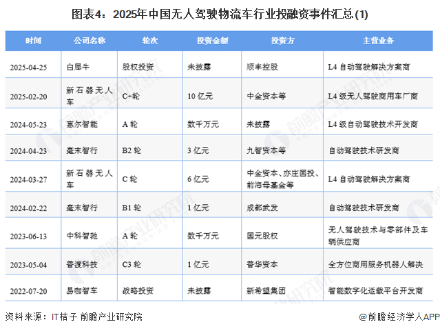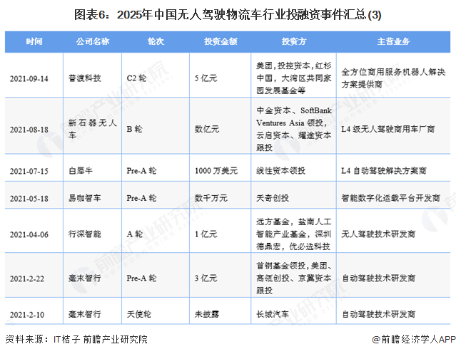 根据前瞻产业研究院报告《2025-2030年中国无人驾驶汽车(自动驾驶汽车)行业发展前景预测与投资战略规划分析报告》整理得出,2025年中国无人驾驶物流车行业涌现出一批最具潜力的企业(排名不分先后,数据来源:企查猫)。