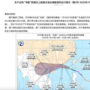 国航在提示信息中称,据中央气象台预报,台风“韦帕”预计7月20日夜间在广东至海南岛东部一带沿海登陆,登陆后继续向偏西方向移动,强度逐渐减弱。受此影响,国航将视天气情况调整或取消7月20日至7月21日广东、广西沿海地区部分进出港航班。