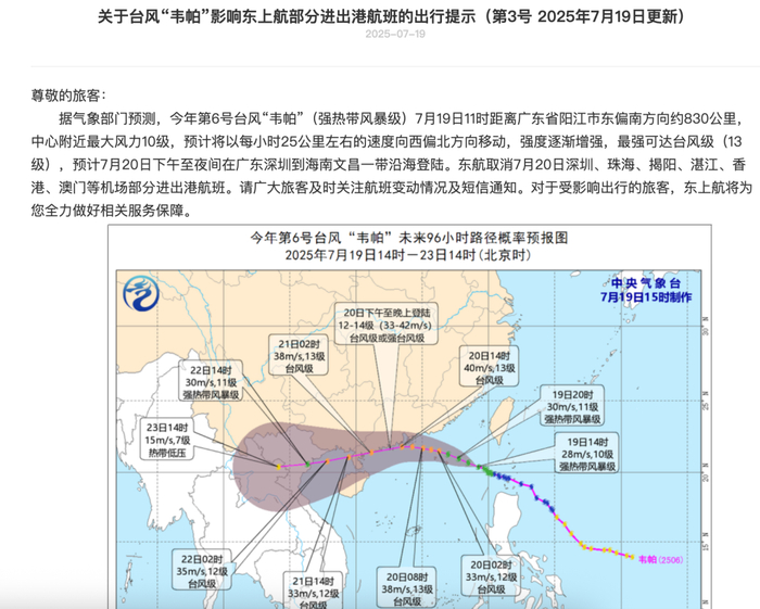 东航发布提示消息称,受台风“韦帕”影响,东航取消7月20日深圳、珠海、揭阳、湛江、香港、澳门等机场部分进出港航班。