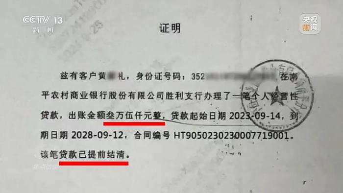 虽说没法还款,但记者却了解到,在黄某礼第三笔申贷档案里,有一份农商行3.5万元贷款提前还款的结清证明。