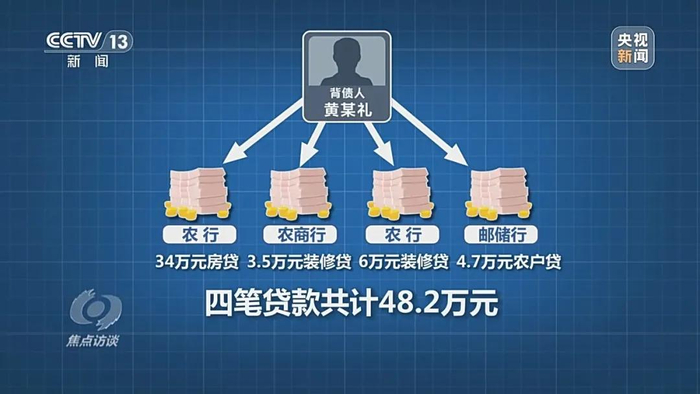 近段时间,村民黄某礼接连收到了当地法院的四份判决书,事由是当地三家银行以“金融借款合同纠纷”起诉黄某礼欠债不还,显示:黄某礼分别借了农业银行34万元房贷和6万元装修贷,以及农商银行3.5万元装修贷,邮政储蓄银行4.7万元农户贷,四笔贷款共计48.2万元。