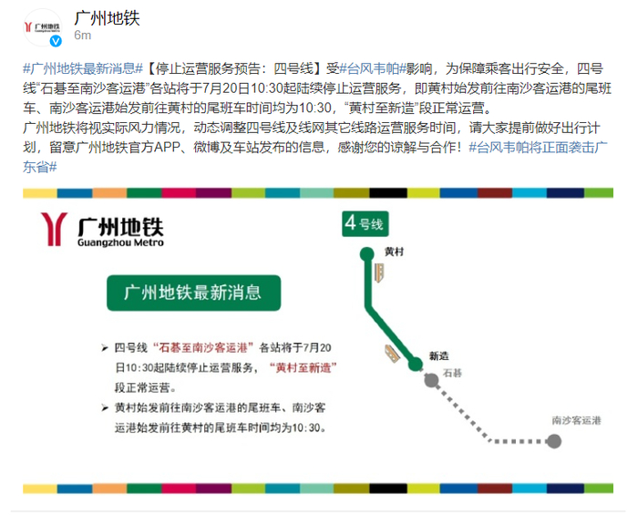 7月20日早上10时,广州地铁发布消息,受台风“韦帕”影响,为保障乘客出行安全,四号线“石碁至南沙客运港”各站将于7月20日10:30起陆续停止运营服务,即黄村始发前往南沙客运港的尾班车、南沙客运港始发前往黄村的尾班车时间均为10:30,“黄村至新造”段正常运营。