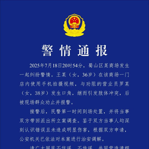 2025年7月18日20时54分,蜀山区某商场发生一起纠纷警情。王某(女,36岁)在该商场一门店内使用手机拍摄视频,与劝阻的营业员罗某(女,38岁)发生口角,继而引发肢体冲突,后被现场群众劝止并报警。