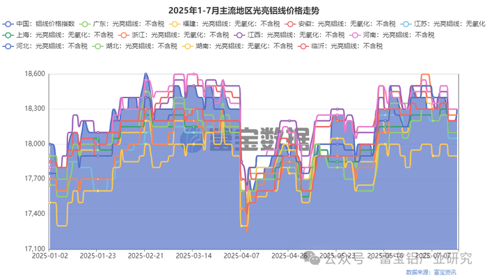 光亮铝线方面,截止7月17日,主流地区亮线价格集中在18200-18400元/吨之间,环比7月10日震荡下跌,幅度100-200元/吨。本期原铝运行区间20400-20600元/吨,持货商逢高出货,市场流通货源趋于宽松,不过低价货源依旧稀少,厂家采购意愿回升。