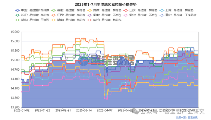 易拉罐方面,截止7月17日,主流地区易拉罐棉花包价格集中报在15000-15300元/吨之间,较7月10日多跌100元/吨左右。期内易拉罐价格跟随现货下跌,尽管市场货源相对依旧偏少,但考虑当下铝企利润空间仍未完全转为盈利,企业对易拉罐高价货源的采购意愿仍不强,市场成交一般。