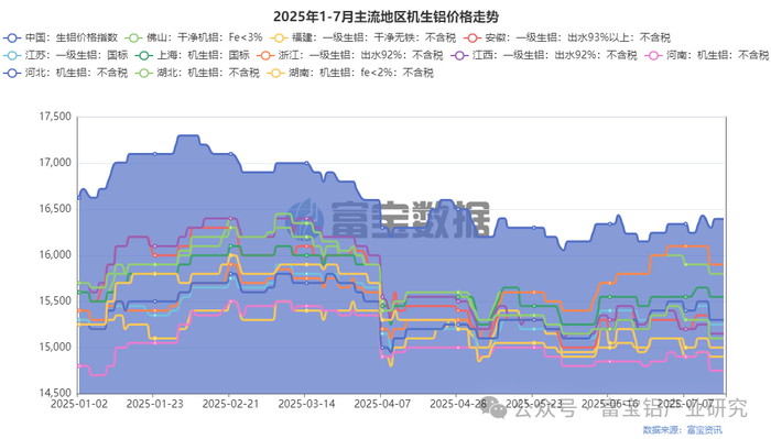 生铝方面,截止7月17日,主流地区机生铝价格集中在15400-15800元/吨之间,较7月10日下跌0-100元/吨不等;期内铸造铝合金企业订单增幅有所放缓,不过对企业而言前期订单大量涌入下生产进程依旧较为紧凑,原料实际需求度增加,不过由于原铝价格重心下移,熟铝性价比再度提高,生铝投炉比例下降,周内部分地区企业价格跟随现货走弱。