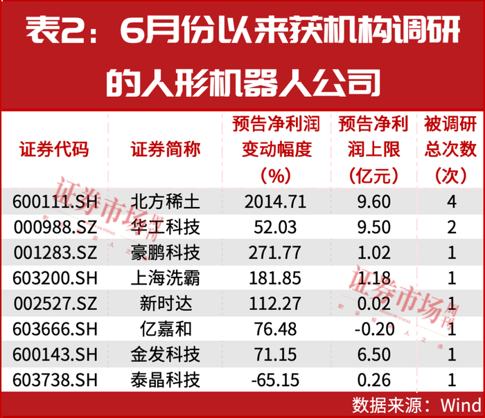 正因人形机器人产业景气度持续旺盛,机构对该行业的关注度持续保持在高位。在已发布中期业绩预期的26家人形机器人概念股中,有25家公司二季度以来获得机构调研,其中,北方稀土被调研次数最多,达11次,其后是新时达、华工科技、金发科技、亿嘉和,分别有5次、4 次、4次、4次,而埃斯顿、三花智控等5家公司也分别有2-3次。