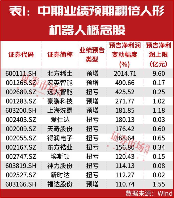 在预期净利润增长的20家公司中,北方稀土、宏英智能、远大智能、埃斯顿、新时达等13家公司实现净利润翻倍增长,其中,北方稀土中期净利润预期增长2014.71%,宏英智能中期净利润预期增长490.66%,远大智能中期净利润预期增长425.52%。