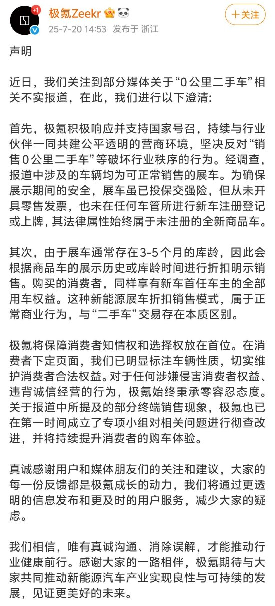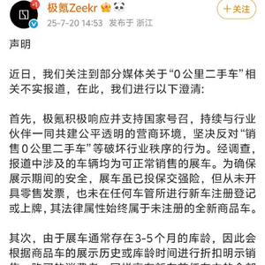 极氪回应“0公里二手车”报道:属正常商业行为,与“二手车”交易存在本质区别