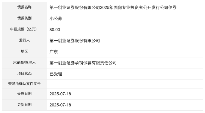 深交所项目进度信息显示,第一创业证券股份有限公司80亿元小公募债项目状态更新为“已受理”,受理日期为2025年7月18日。募集说明书申报稿显示,本次债券募集资金扣除发行费用后,拟将不低于40亿元用于偿还有息债务,不超过40亿元用于补充流动资金。
