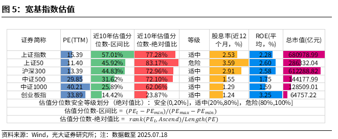 截至2025年7月18日,宽基指数来看,上证50处于估值分位数“危险”等级,其余各大宽基指数处于估值分位数“适中”等级。