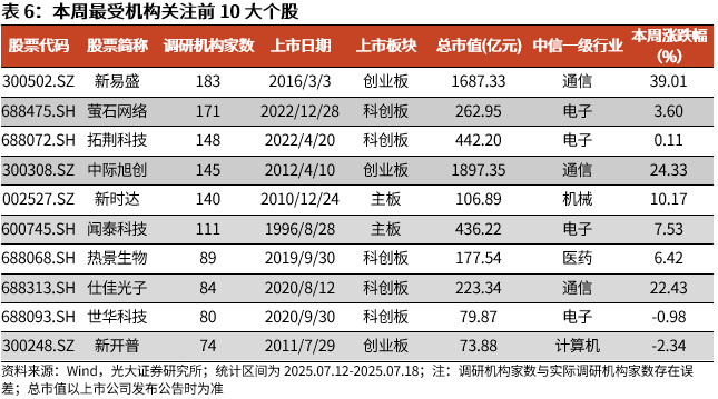 从个股来看,本周受到机构关注程度最高的前5大个股依次为新易盛(183家)、萤石网络(171家)、拓荆科技(148家)、中际旭创(145家)和新时达(140家)。