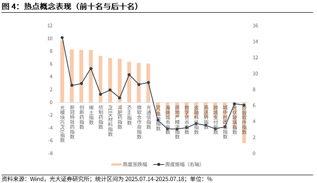 从热点概念来看,本周概念指数中表现最好的前5大概念依次为光模块(CPO)指数、新冠特效药指数、创新药指数、稀土指数、仿制药指数;表现最差的5大概念依次为炒股软件指数、光伏玻璃指数、城中村改造指数、跨境支付指数、高送转指数。