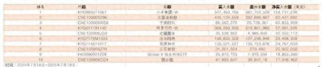 截至2025年7月18日,过去一年,韩国股民净买入金额排名前10的港股分别为小米集团-W、比亚迪股份、宁德时代、阿里巴巴-W、老铺黄金、泡泡玛特、百济神州、三花智控、Global X 恒生科技ETF、优必选。