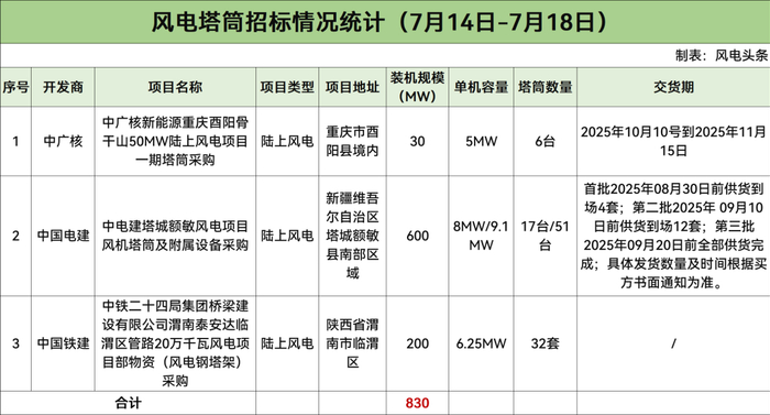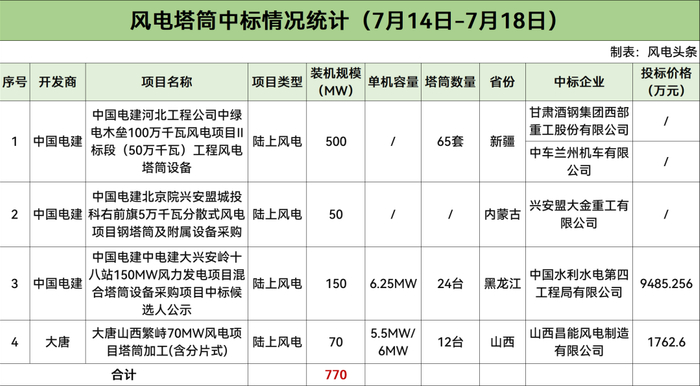据风电头条统计,本周有4个陆上风电项目塔筒采购开标,规模为770MW,开发商为中国电建、大唐。