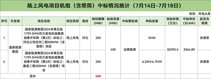 据风电头条统计,本周含塔筒陆上风电项目共计2个,规模总计400MW。