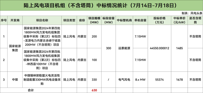 陆上不含塔筒最低1485元/kW!本周1.03GW风机开标!【风电项目·周分析】