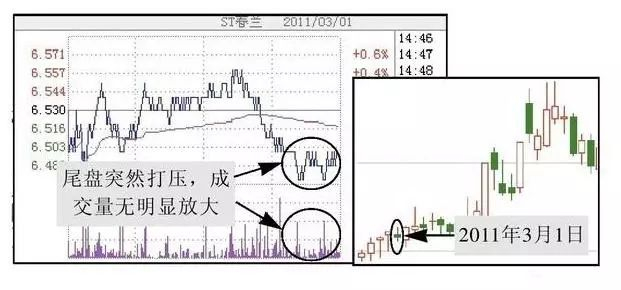 从图中可以看出,全天股价和成交量都很平淡,突然在要收盘前几分钟股价被拉得很高。