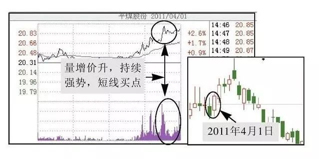 从图中可以看出,全天股价和成交量都很平淡,突然在尾盘时成交量急速放大,股价也被拉高,呈现出量增价升的态势。再对应到该日的K线图可以看出,股价经过几日上涨后就开始下跌,短线投资者可在此买入,然后在股价走软时卖出。