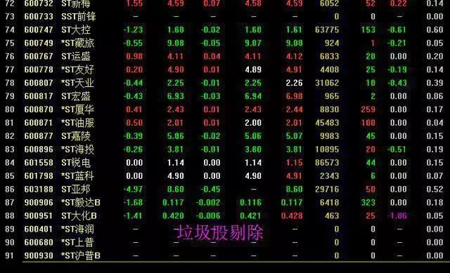 首先最为明显的就是被带帽的ST股,存在退市风险股,91只垃圾股剔除,