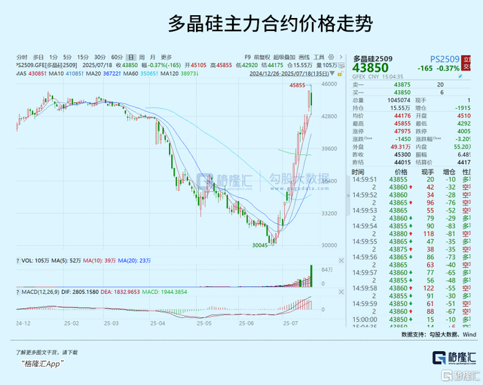 在其中,7月以来,多晶硅品种近期持续走出强势飙升。7月17日多晶硅期货9月合约跳空高开高走最终大幅收涨7.24%,次日又一度飙升超过4%,最高报45855元/吨,为自6月底的30045元/吨以来累计飙升超过50%。不少业内人士认为,多晶硅的近期走势,显然就是一轮强势的逼空行情。